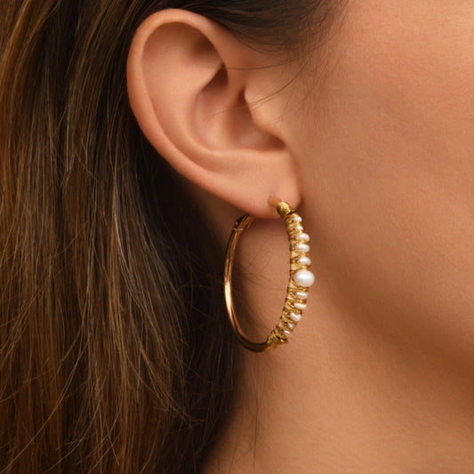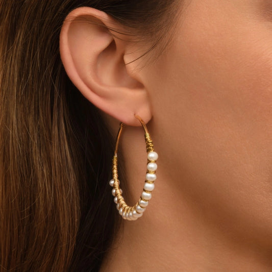 Boucles d'oreilles créoles Panarea tissées de perles de rivière- blanc