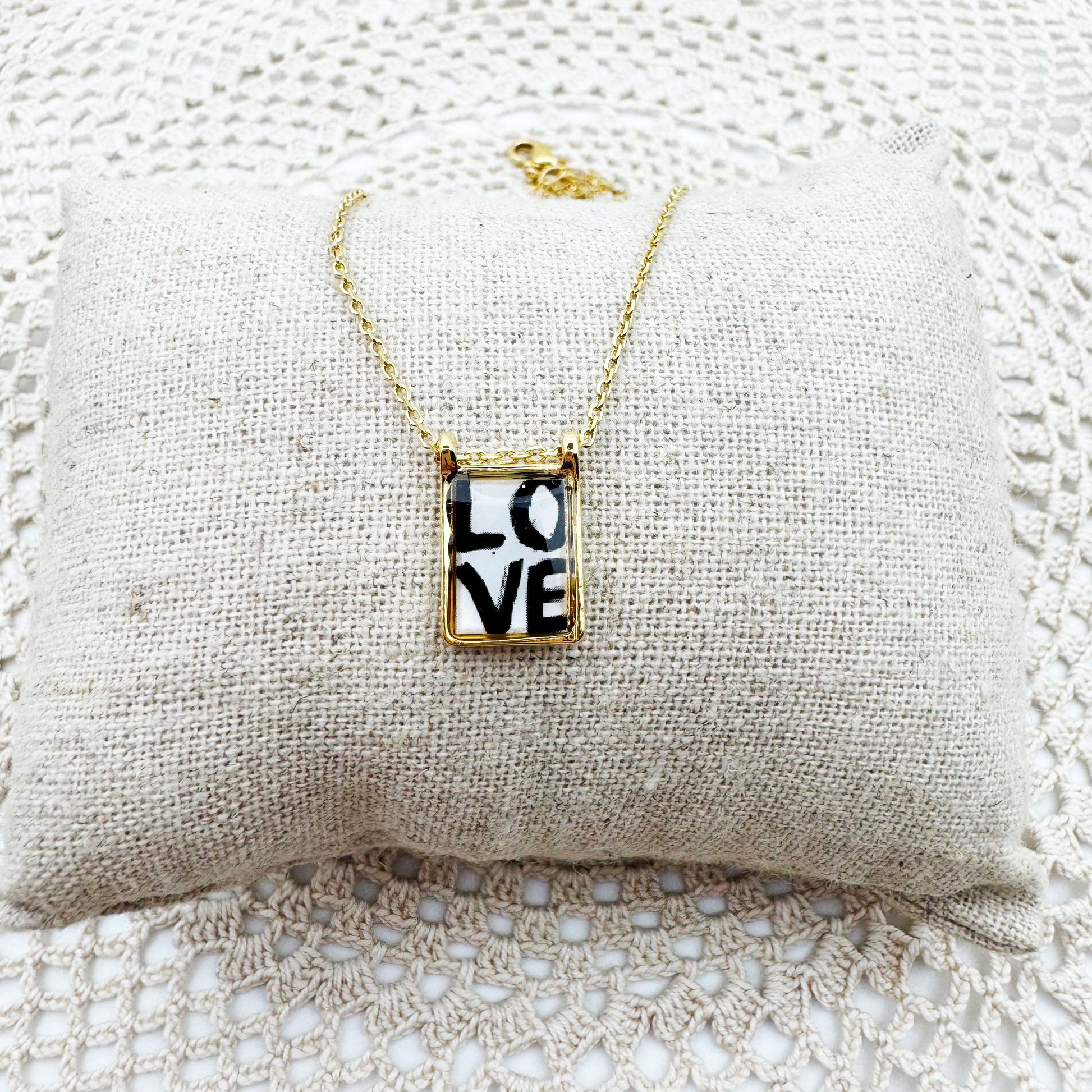 Collier chaîne fine avec une médaille rectangulaire renfermant un symbole.