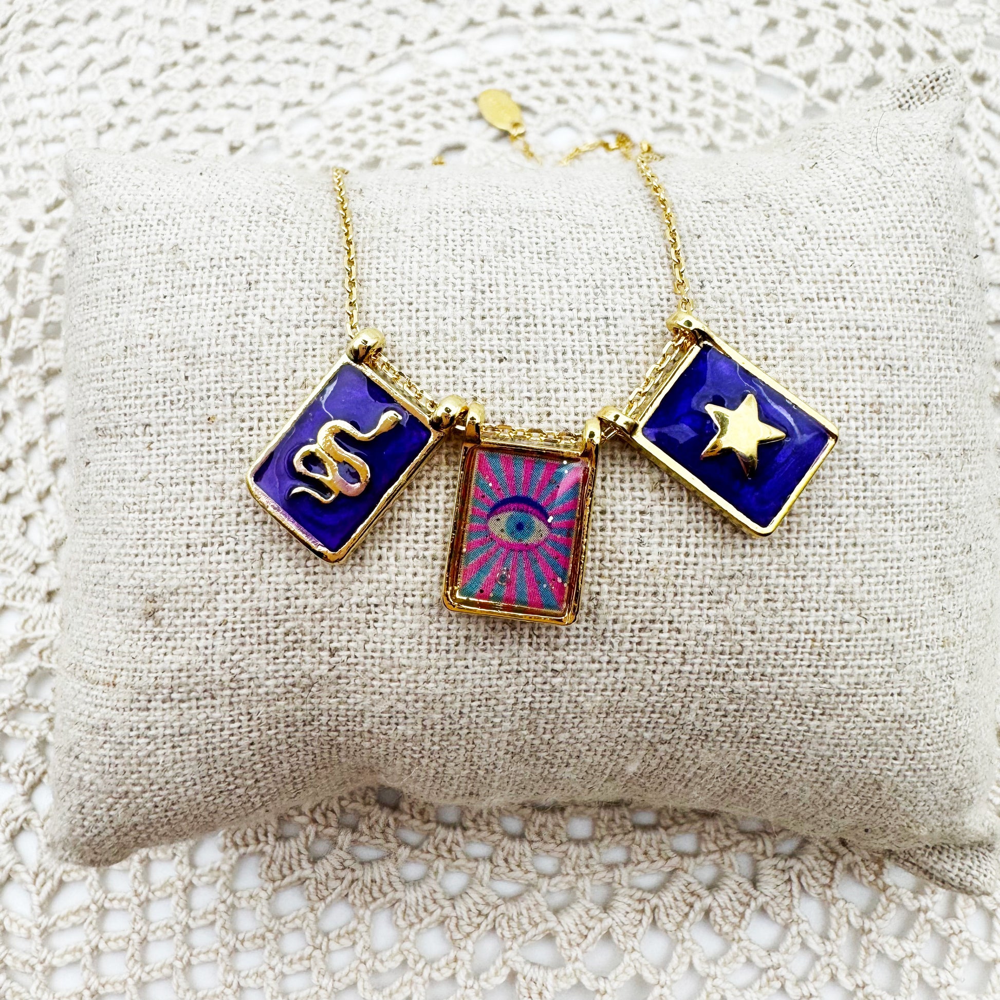Collier chaîne fine composé de 3 scapulaires renfermant un symbole.