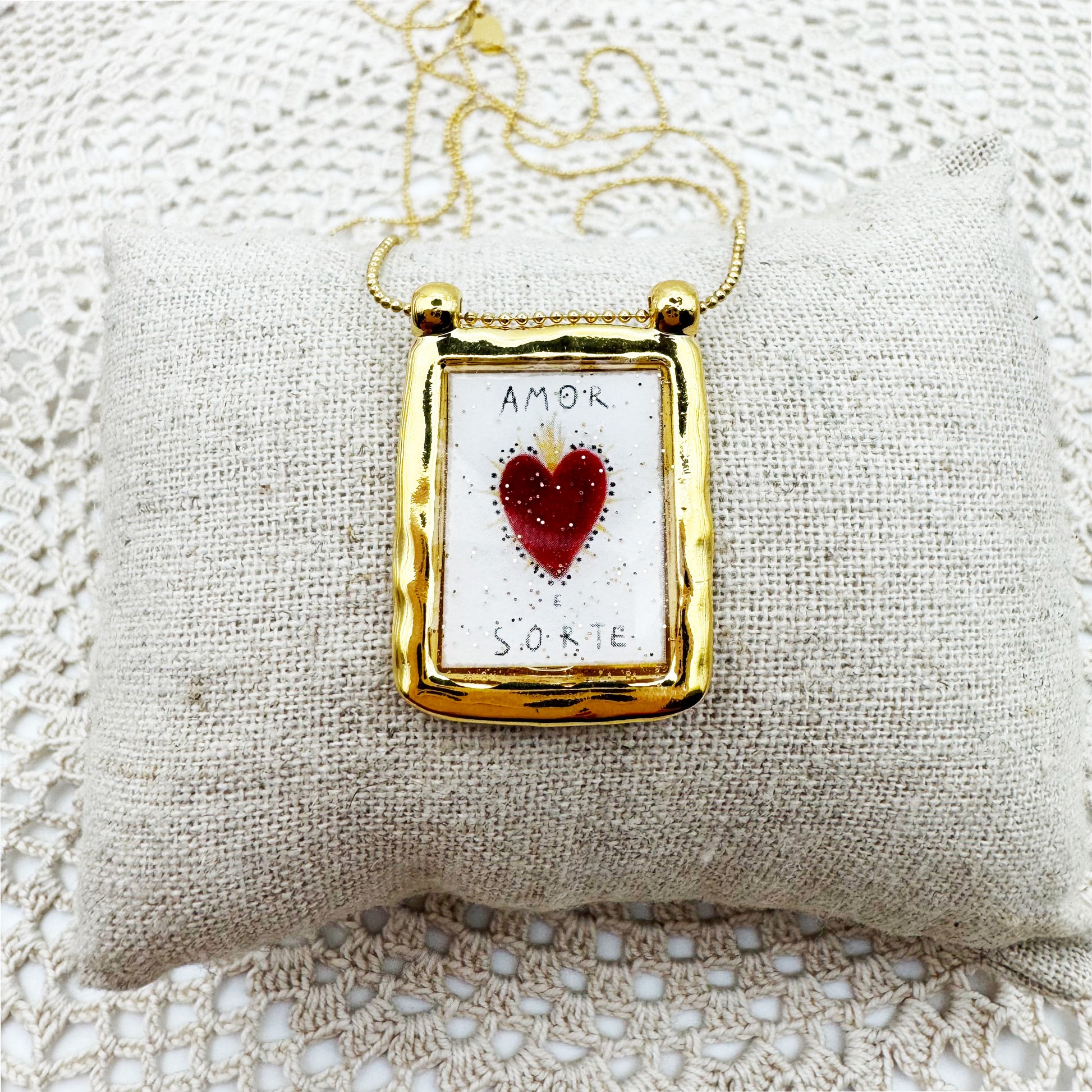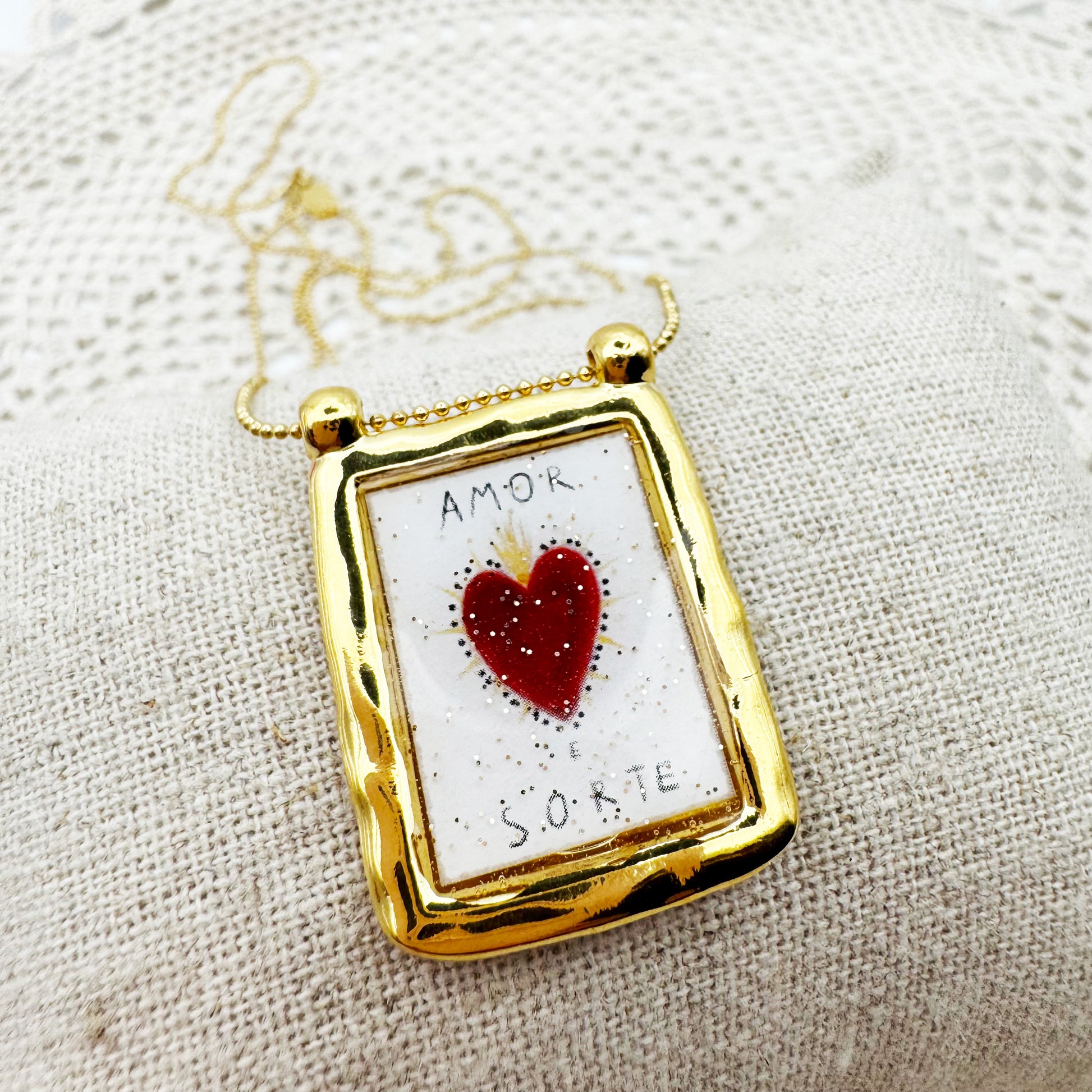 Sautoir sur chaîne fine billes et médaille rectangulaire aux bords martelés renfermant un symbole, une icône, un porte-bonheur.