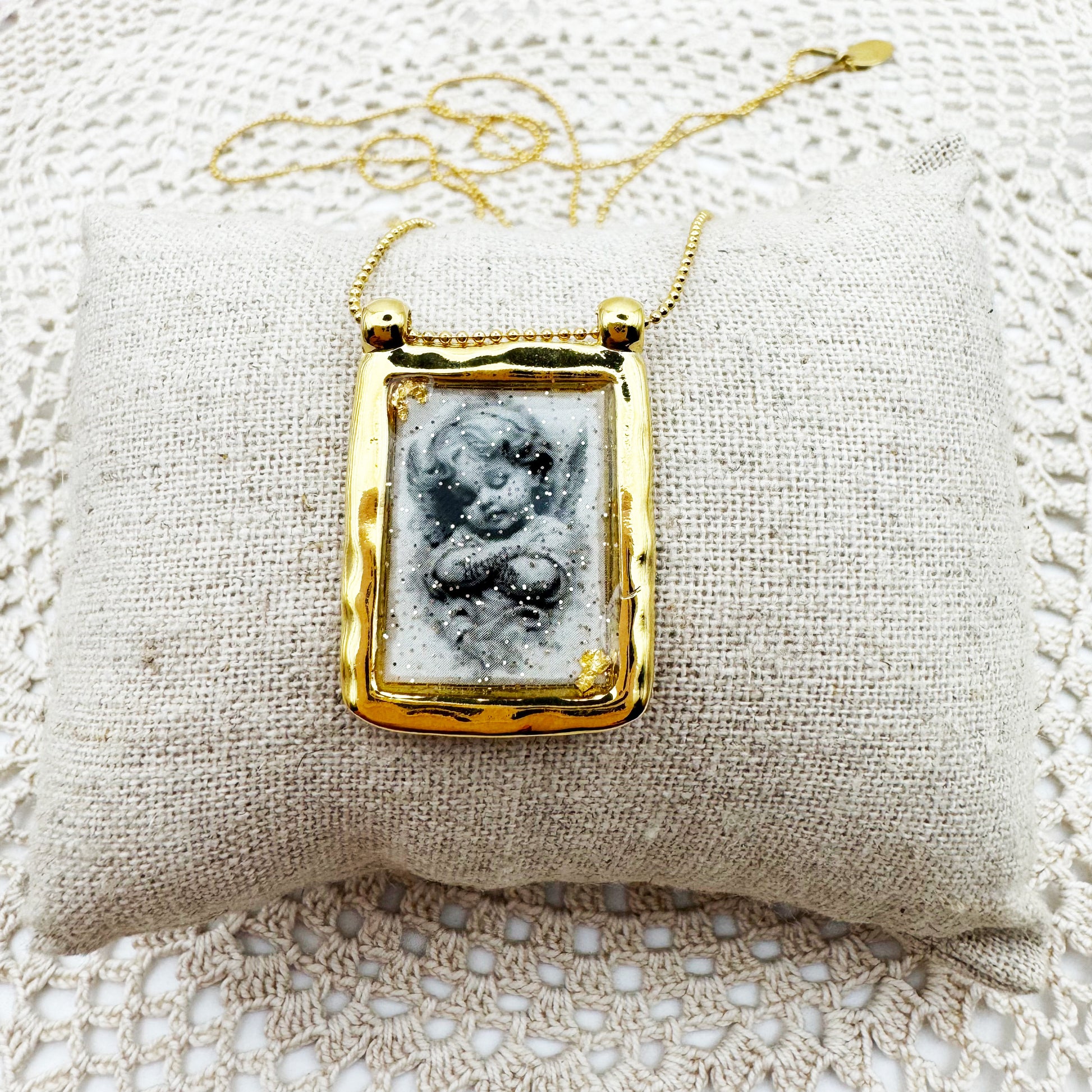 Sautoir sur chaîne fine billes et médaille rectangulaire aux bords martelés renfermant un symbole, une icône, un porte-bonheur.