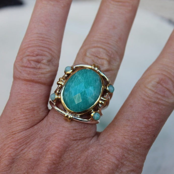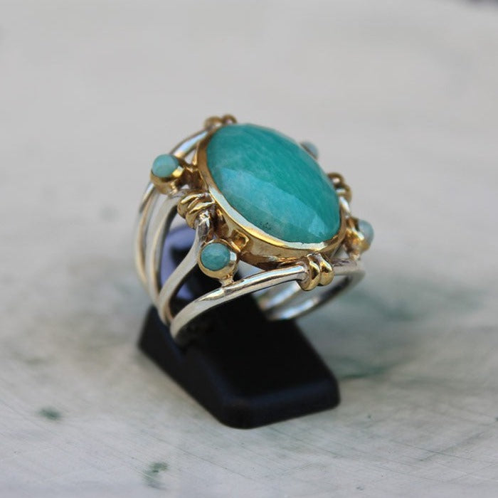 Composée de 4 fils qui forment l'anneau et de 5 pierres d'amazonite magnifiques, cette bague ne vous laissera pas insensible.
