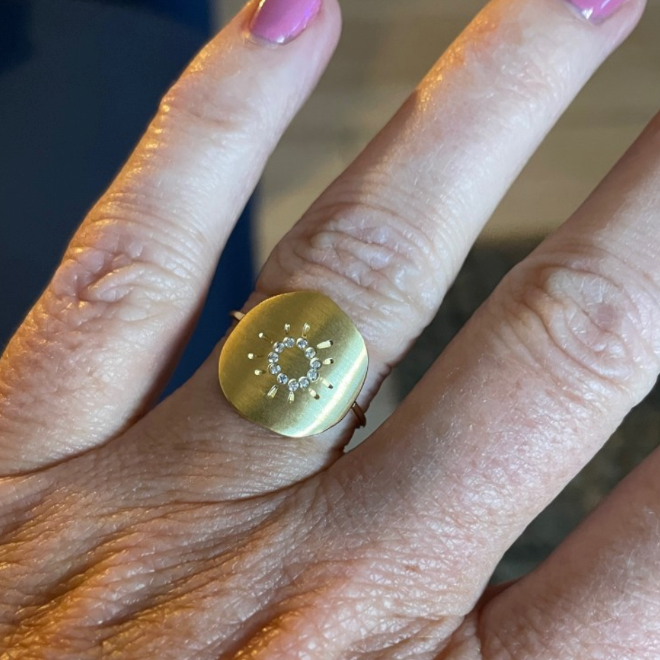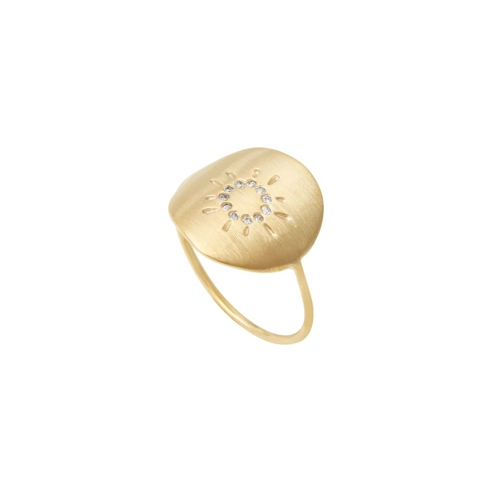 Bague en plaqué or 3 microns, aux finitions mates et brossées et sertie d'un soleil en zircons blancs.