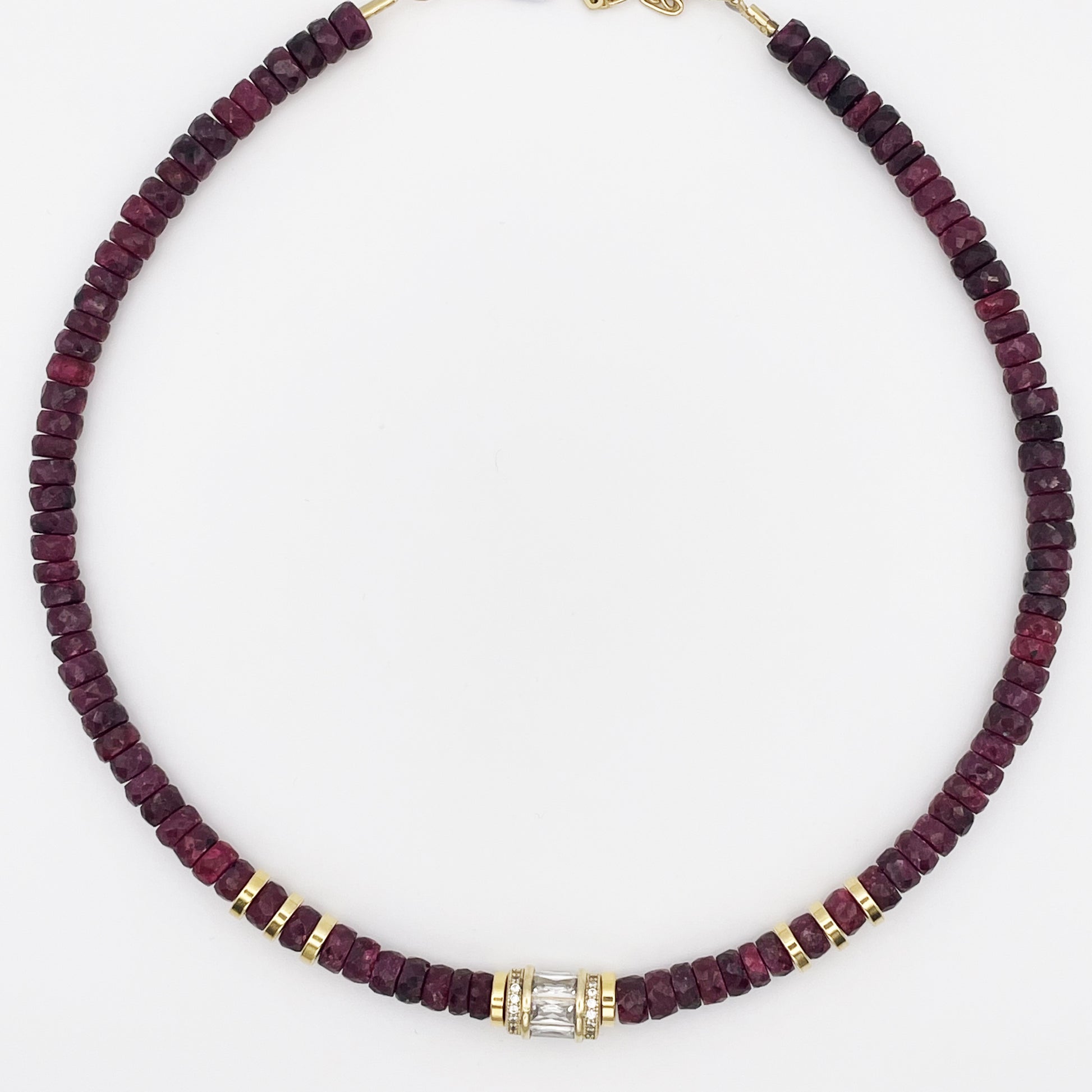 Collier chocker, ras du cou, en pierres de rubis avec une pièce en plaqué or pavée de zircons et trois perles ovales de chaque côté.