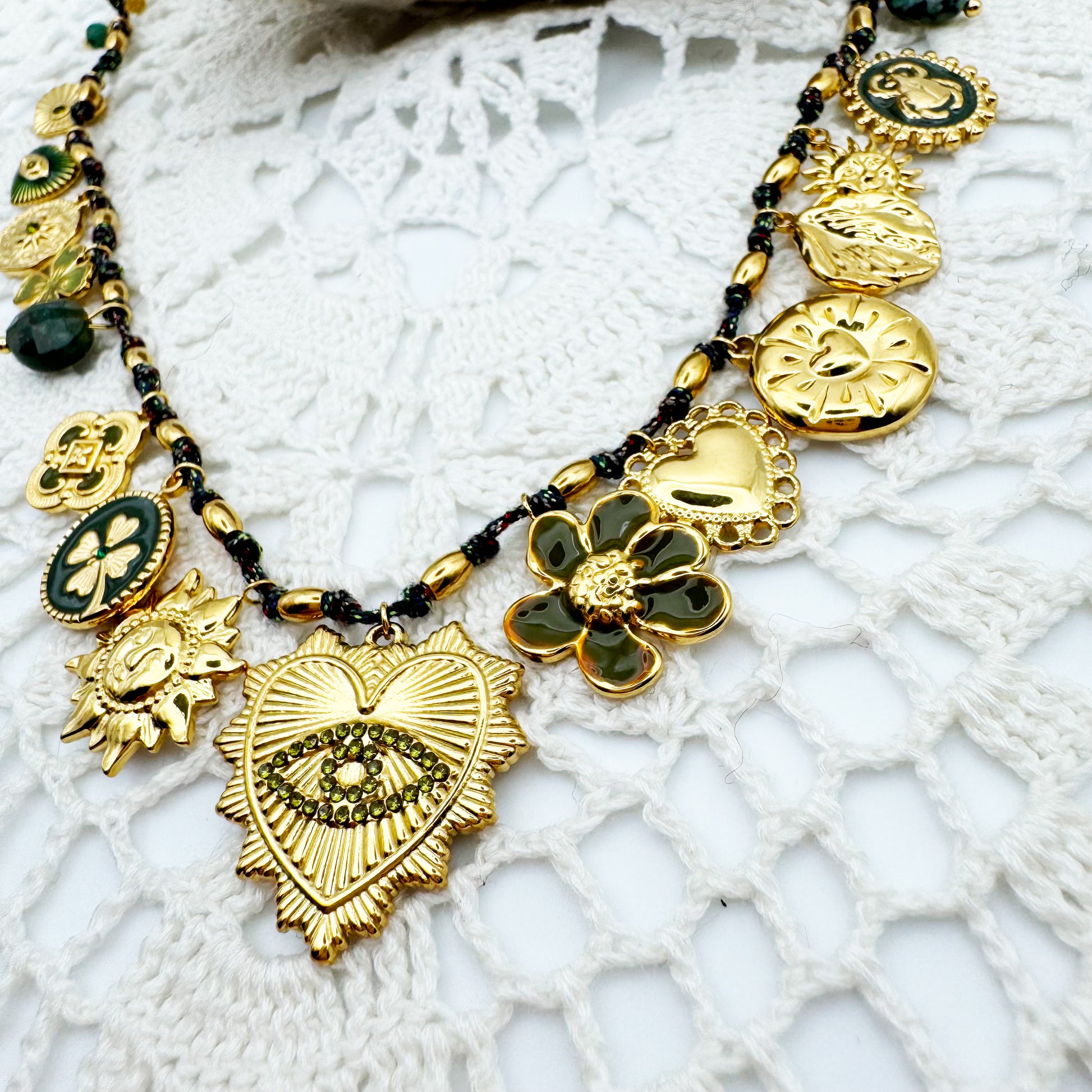 Collier Fil Pampilles Coeur Oeil Strass Kaki